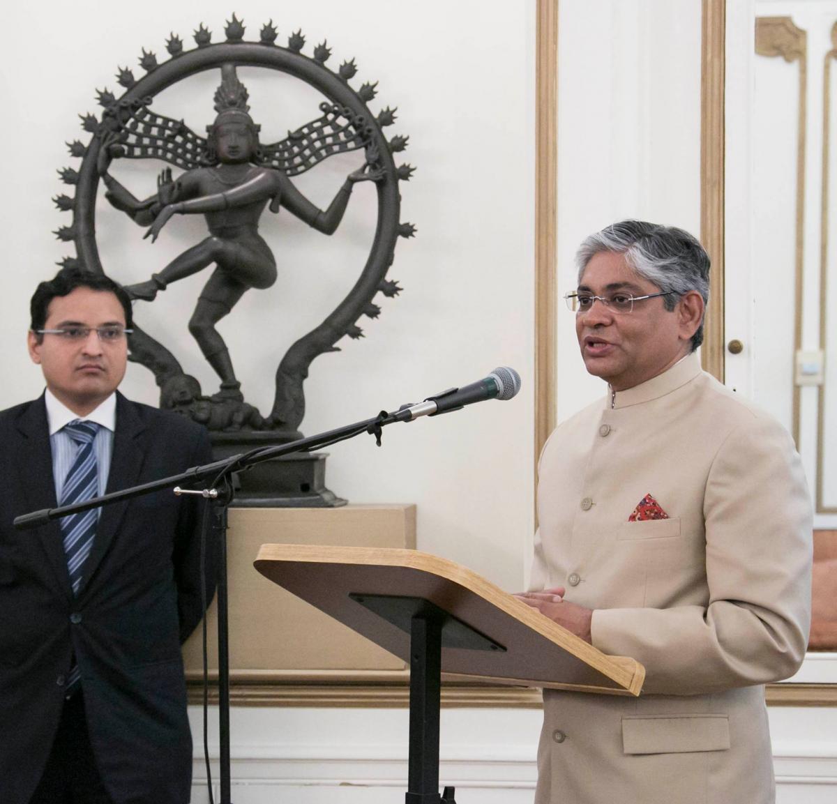 Indian Ambassador Arun K. Singh addressing the gathering at the Baisakhi celebration in the Embassy Residence. Seen at left is First Secretary Suneet Mehta who served as the master of ceremonies. Photo credit: Embassy of India, Washington, DC.